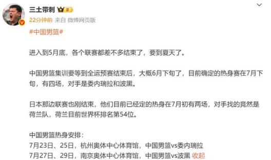 “進(jìn)入到5月底,各個(gè)聯(lián)賽都差不多結(jié)束了,要到夏天了。中國男籃集訓(xùn)要等到全運(yùn)預(yù)賽結(jié)束后,大概6月下旬了,目前確定的熱身在7月下旬,有四場,對手是委內(nèi)瑞拉和波黑。日本那邊聯(lián)賽也剛結(jié)束,他們目前已經(jīng)定的熱身在7月初有兩場,對手找的竟然是荷蘭隊(duì),荷蘭目前世界杯排名第54位。