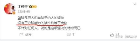看到楊溢的表現(xiàn),也引起媒體人丁佳寧的不滿,他點(diǎn)評(píng)說矮個(gè)子沒籃就是廢物。他原話是這樣說,“籃球是巨人和有腦子的人的運(yùn)動(dòng),沒有三分球能力的矮個(gè)約等于廢物。不針對(duì)任何人,說的是這項(xiàng)運(yùn)動(dòng)的特點(diǎn)而已?!彪m然丁佳寧不點(diǎn)名是誰,但聯(lián)系到場(chǎng)上的表現(xiàn),顯然指的是楊溢。因?yàn)槌说?2分的朱正,沒有誰和楊溢一樣矮了。