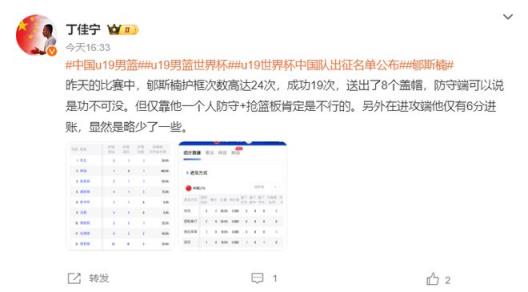 根據(jù)丁佳寧的數(shù)據(jù),郇斯楠第一場對(duì)陣加拿大護(hù)框次數(shù)高達(dá)24次,成功19次,送出了8個(gè)蓋帽。