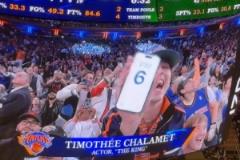 第三節(jié)末段,尼克斯已領(lǐng)先逾40分?,F(xiàn)場(chǎng)觀戰(zhàn)的演員“甜茶”提莫西-查拉梅登上大屏幕,他戴上尼克斯鴨舌帽并秀出自己屏?!峥怂?場(chǎng)解決戰(zhàn)斗,現(xiàn)場(chǎng)一片歡呼。