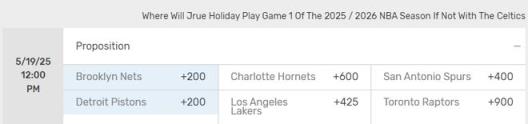 關(guān)于霍勒迪的最新下家賠率已經(jīng)出爐,如果他離開綠軍,他最有可能去哪兒?休賽期擁有最大薪金空間的籃網(wǎng)以及本賽季進(jìn)步明顯的活塞并列第一,兩隊(duì)同為+200,馬刺+400排名第三,湖人+425位居第四,黃蜂+600排第五,猛龍+900位居第六。