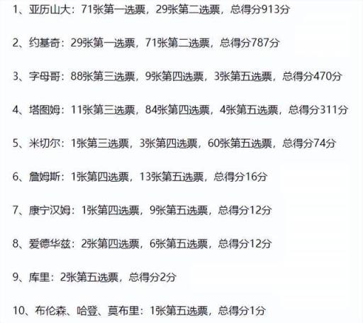除此之外,NBA官方還公布了MVP的詳細(xì)投票數(shù)據(jù),果然排在第一的是亞歷山大,總得分913分,約基奇緊隨其后,787分,這兩人斷崖式領(lǐng)先,除此之外再無(wú)500分以上的球星。第三、四、五位的分別是塔圖姆、字母哥和米切爾。湖人老將詹姆斯排在第六,但只有16分。而勇士球星庫(kù)里排在MVP榜單的第九,但是總得分只有2分。從詳細(xì)得分看,詹姆斯遠(yuǎn)不及亞歷山大的零頭,庫(kù)里投票得分不及詹姆斯的零頭。傷害性不大、侮辱性極強(qiáng)。
