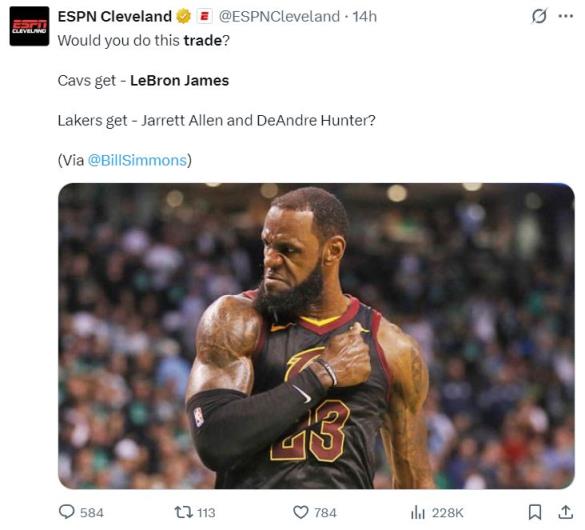 實際上過去三年比爾-西蒙斯多次建議詹姆斯被換回克利夫蘭,他希望勒布朗生涯的最后一年在克利夫蘭度過,但LAL怎么可能放走勒布朗這個“搖錢樹”?勒布朗就是票房與曝光率的保證,珍妮-巴斯沒有其他資產(chǎn),一大家子都指著湖人賺錢呢。