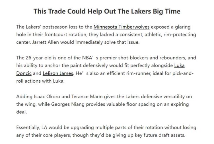 北京時間5月27日晚,美媒FW為湖人指明了補強五號位的方向——賈萊特-阿倫,但這次并不是用勒布朗換,而是一筆三方大交易,佩林卡得梭哈。