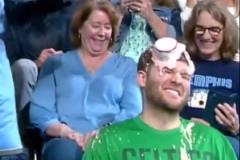 比賽期間,灰熊吉祥物將幾個冰淇淋直接澆在了一名身穿綠軍球衣的觀眾頭上,小哥滿臉笑容情緒異常穩(wěn)定。