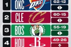 1-5:雷霆(上期第1)、騎士(2)、凱爾特人(3)、火箭(8)、勇士(4);