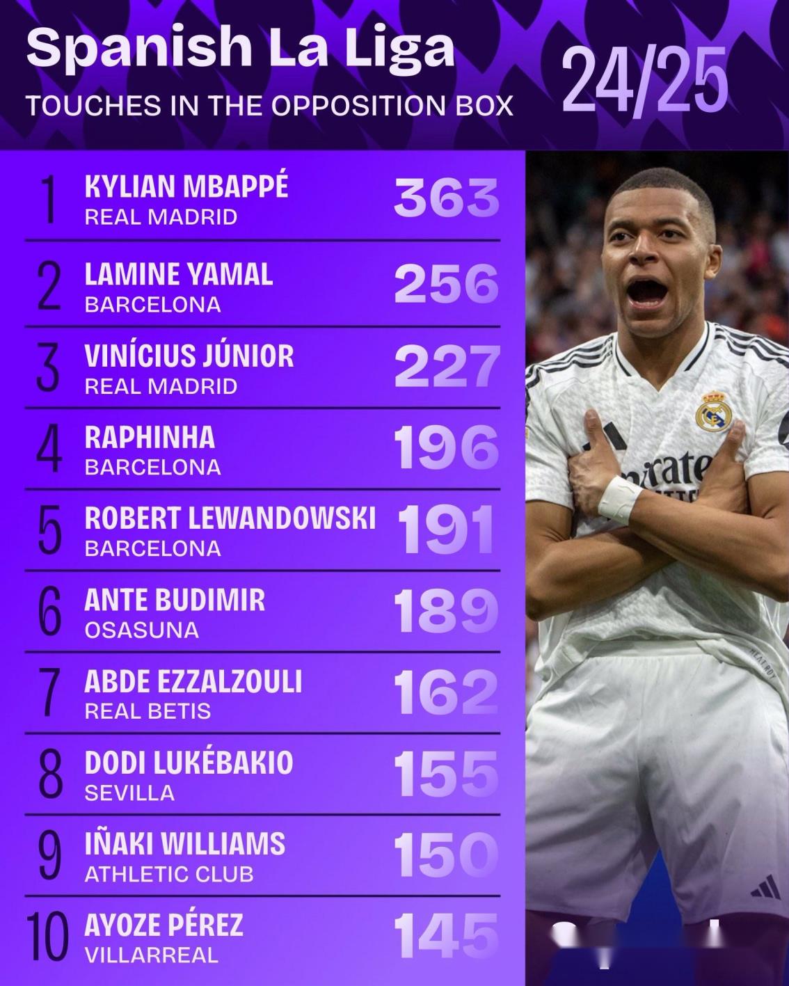 2024/25賽季西甲聯(lián)賽對方禁區(qū)內觸球次數排行榜
