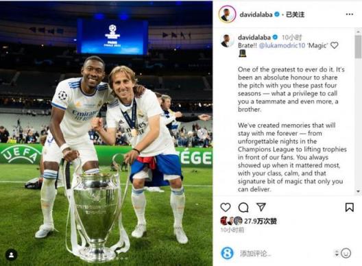 阿拉巴社媒曬出與莫德里奇的合照:“兄弟!莫德里奇‘魔法’”