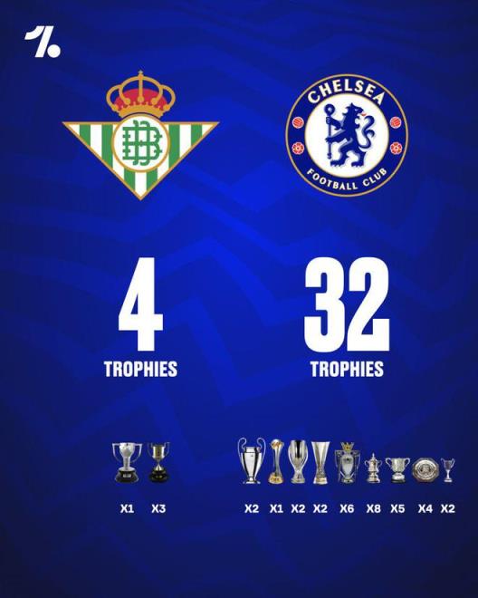 北京時(shí)間5月29日,皇家貝蒂斯和切爾西將在史拉斯科球場爭奪本賽季歐協(xié)聯(lián)冠軍。在決賽開始前,足球媒體OneFootball在社媒上發(fā)布了兩隊(duì)歷史榮譽(yù)數(shù)量的對比。