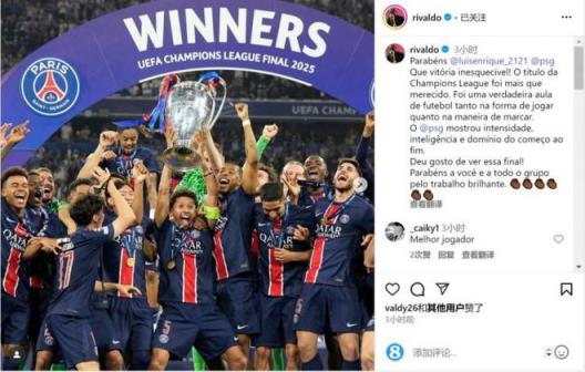 直播吧6月1日訊 歐冠決賽,巴黎5-0擊敗國米,隊史首次問鼎歐冠。巴西足壇名宿里瓦爾多社媒發(fā)文,祝賀巴黎和恩里克。