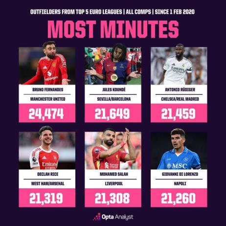 今夜,曼聯(lián)將與熱刺會(huì)師歐聯(lián)決賽。賽前,Opta Analyst統(tǒng)計(jì)了自2020年2月1日以來(lái)的五大聯(lián)賽球員的出場(chǎng)時(shí)間。結(jié)果顯示,曼聯(lián)隊(duì)長(zhǎng)B費(fèi)出場(chǎng)時(shí)間冠絕五大聯(lián)賽。
