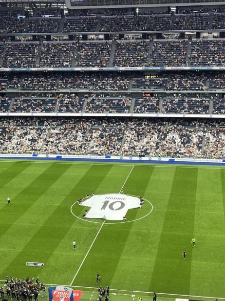 在比賽開始前,皇馬也為莫德里奇擺出了巨型球衣。莫德里奇自2012年以3500萬歐的價格從熱刺轉(zhuǎn)會至皇馬,為皇馬效力13個年頭。期間贏下6座歐冠獎杯,4個西甲冠軍,2個國王杯冠軍,并在2018年獲得金球獎和世界足球先生。