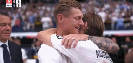 在全場(chǎng)球迷的掌聲中,莫德里奇被換下場(chǎng),雙方球員列隊(duì)致敬,克羅斯上前與其擁抱。