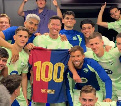 萊萬加盟巴薩至今出戰(zhàn)147場比賽,打進(jìn)101球(20助),賽后他獲贈巴薩生涯百球里程碑紀(jì)念球衣,并手拿球衣與隊友們在更衣室內(nèi)合影。