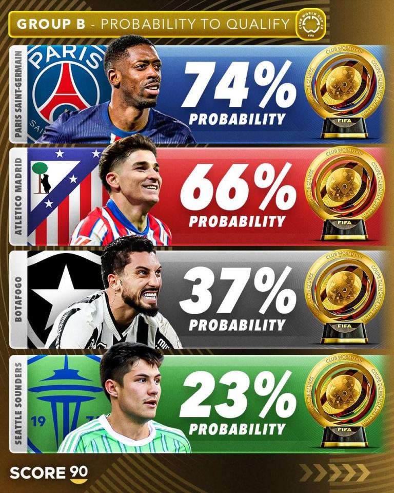法甲豪門巴黎圣日耳曼以74%的概率高居榜首,成為小組最被看好的出線隊(duì)伍。西甲勁旅馬德里競技緊隨其后,晉級概率為66%。來自巴西的博塔弗戈晉級概率為37%,而美職聯(lián)球隊(duì)西雅圖海灣人僅為23%,出線形勢最為嚴(yán)峻。