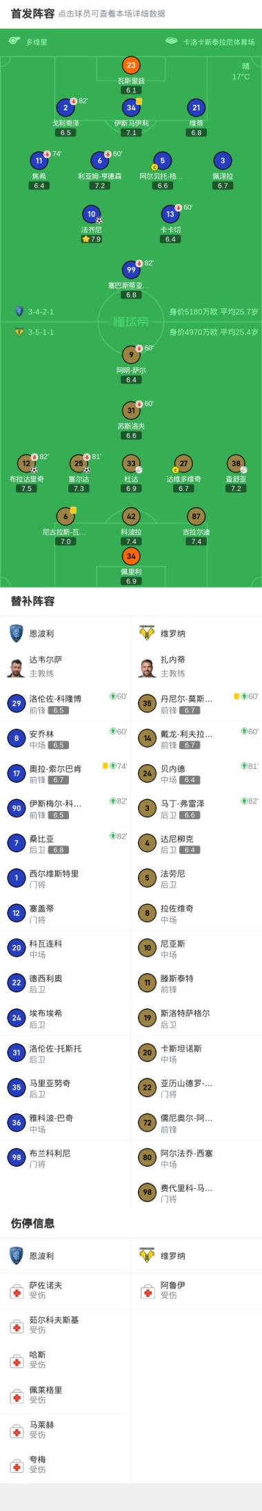 第43分鐘,恩波利球員法齊尼打入一球。