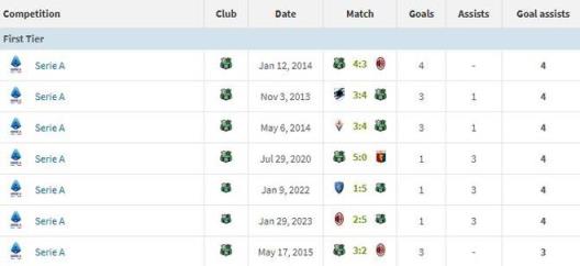 貝拉爾迪截至目前,在對陣米蘭的20場比賽中,打入11球,制造7個(gè)助攻,并且有3次對陣米蘭制造了3+個(gè)進(jìn)球: