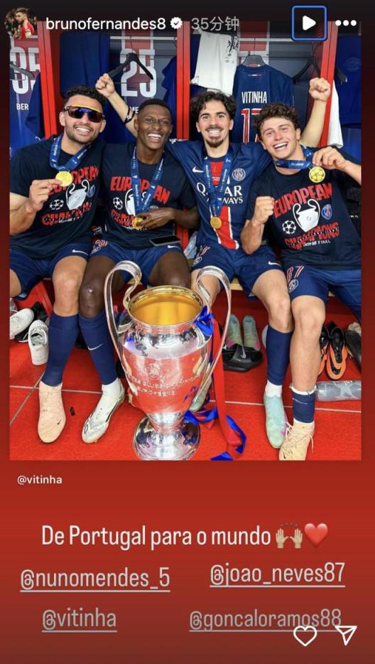 在巴黎圣日耳曼奪得2024-25賽季歐冠冠軍后,曼聯(lián)中場布魯諾-費(fèi)爾南德斯為巴黎陣中的葡萄牙國家隊(duì)隊(duì)友們送上祝賀。