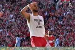 進球后的加克波激動脫掉上衣慶祝,露出打底內(nèi)衣,上面顯示英文:I BELONG TO JESUS(與主同行)。這一幕令人似曾相識,曾經(jīng)的米蘭王子卡卡也有類似標語的上衣。