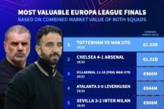 5月21日訊 據(jù)統(tǒng)計,熱刺vs曼聯(lián)的歐聯(lián)決賽是身價最高的歐聯(lián)決賽對陣,兩隊總身價15.3億歐。