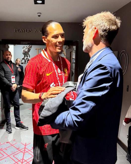 賽后,克洛普在社交媒體曬出他與斯洛特以及范戴克的合照,并送上祝賀。