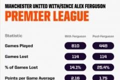 4月6日訊 Opta統(tǒng)計了弗格森執(zhí)教期間以及后爵爺時代曼聯(lián)的英超數(shù)據(jù),并做出對比。如果曼聯(lián)在今晚的德比戰(zhàn)中落敗,后爵爺時代輸球場次將超過弗格森執(zhí)教時期。
