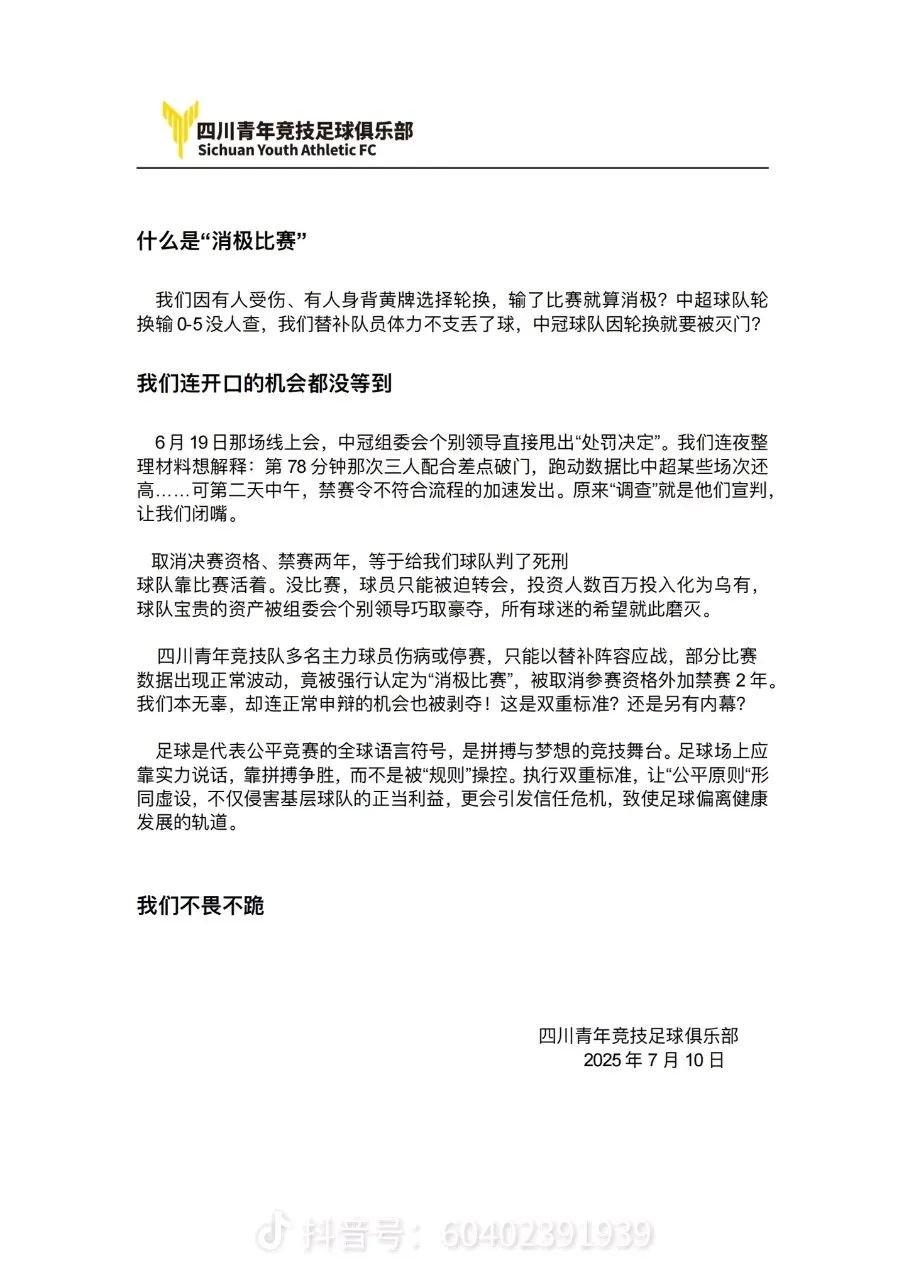 7月10日晚,被中國足協(xié)處以禁賽兩年的中冠球隊(duì)四川青年競技再次發(fā)聲,繼續(xù)強(qiáng)調(diào)受到了不公正待遇。